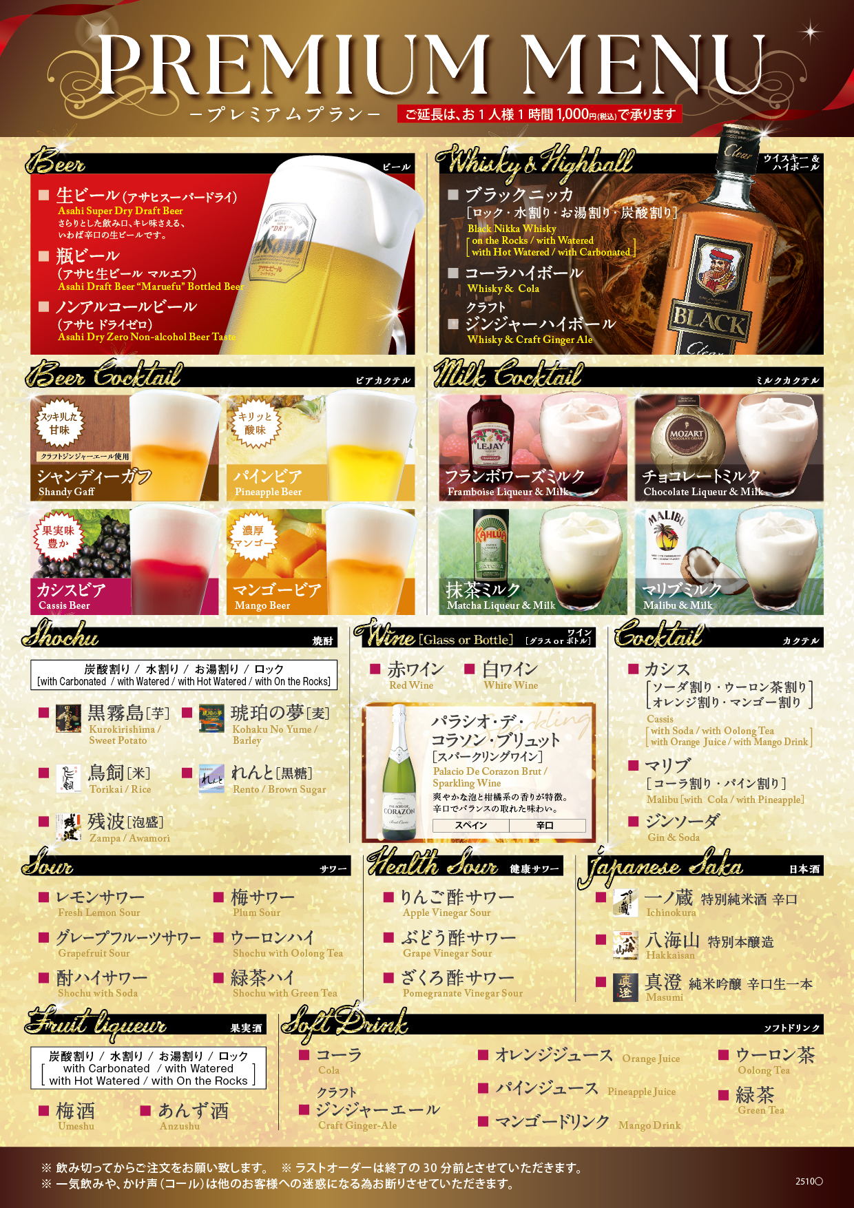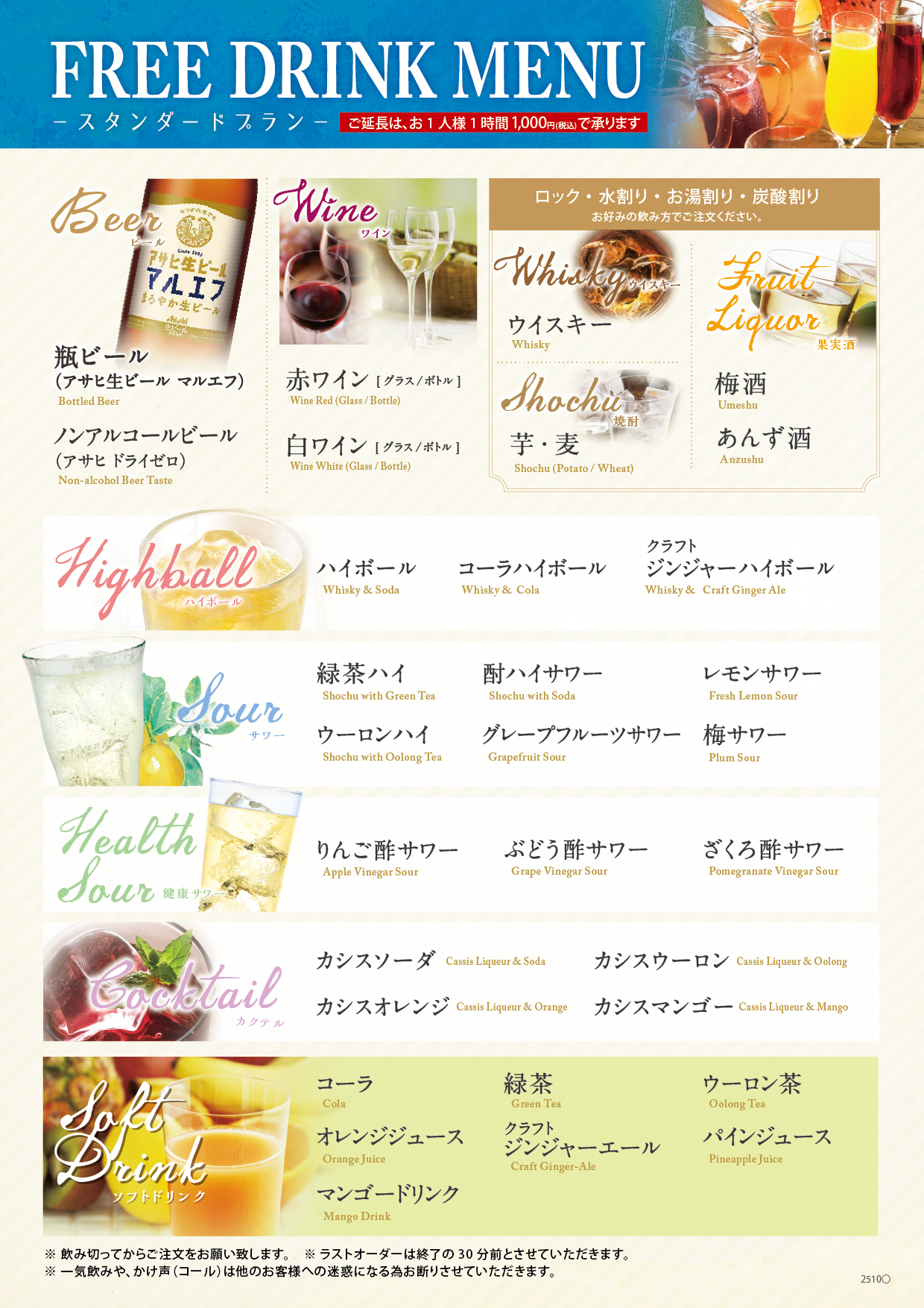 | 補足事項 | ◎20歳未満のお客様の飲酒は固くお断りいたします。年齢のご確認(学生証・免許証のご呈示)をさせていただく場合がございます。 ◎車両を運転してお帰りのお客様には、アルコール類のご提供は致しかねますのでご了承ください。 |